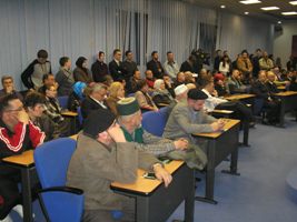 Prepuna sala Bosanskog kulturnog centra u Tuzli. Mnogi su ostali na hodniku ili ispred sale. Veliko zanimanje za promociju knjige „Riječ imama i šejha šehida Mehmed-efendije Hafizovića (vazovi, dersovi, hutbe)“ priređivača hadži Ediba Kravića.